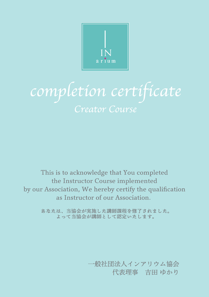 ・クリエイターコース認定レッスンは受講後会員になることができる一般社団法人インアリウム協会が定めるディプロマコースになります。