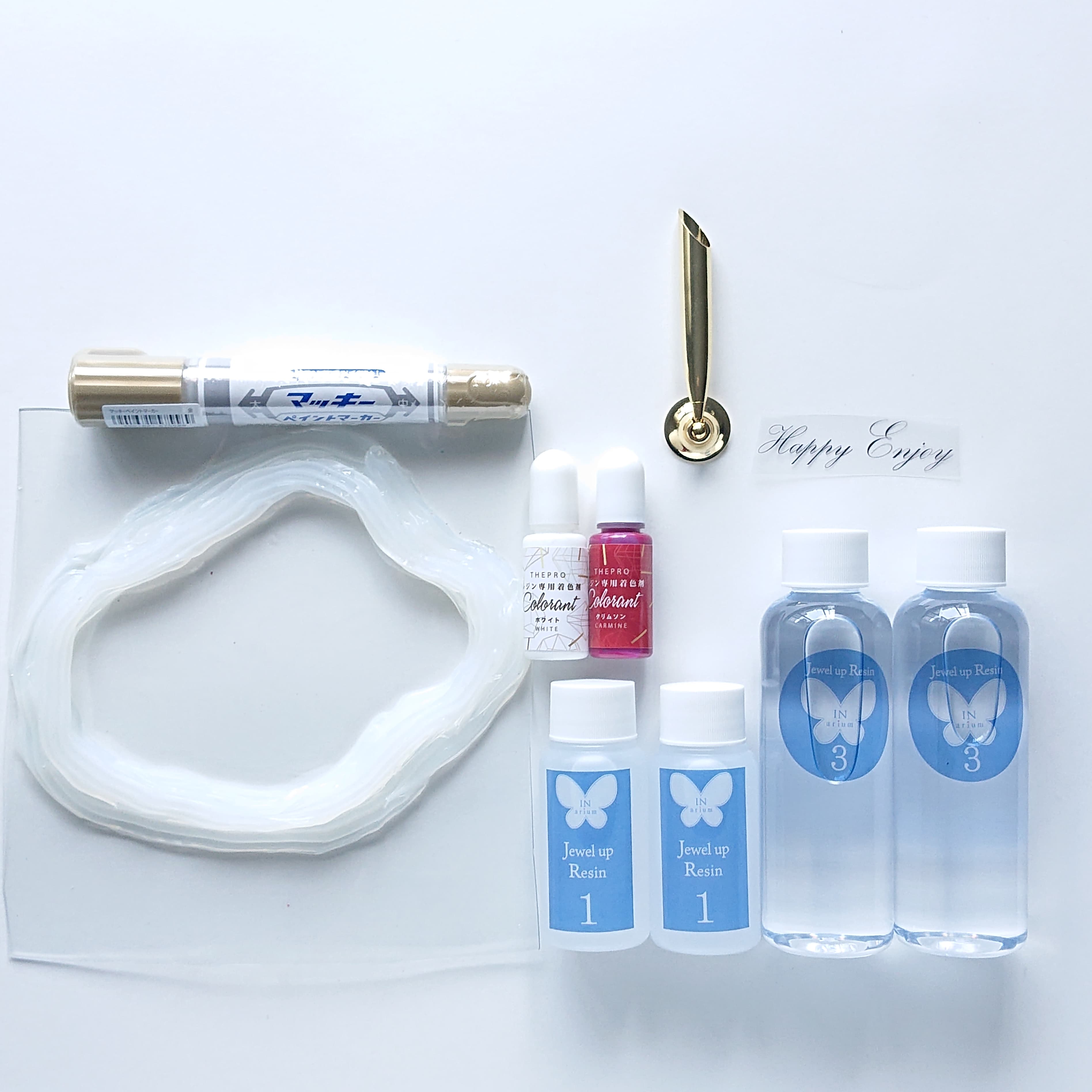 作成キット(オリジナルモールド・ペンスタンド・インアリウムレジン・着色剤・縁を金色に縁取るためのペン・透明シート)