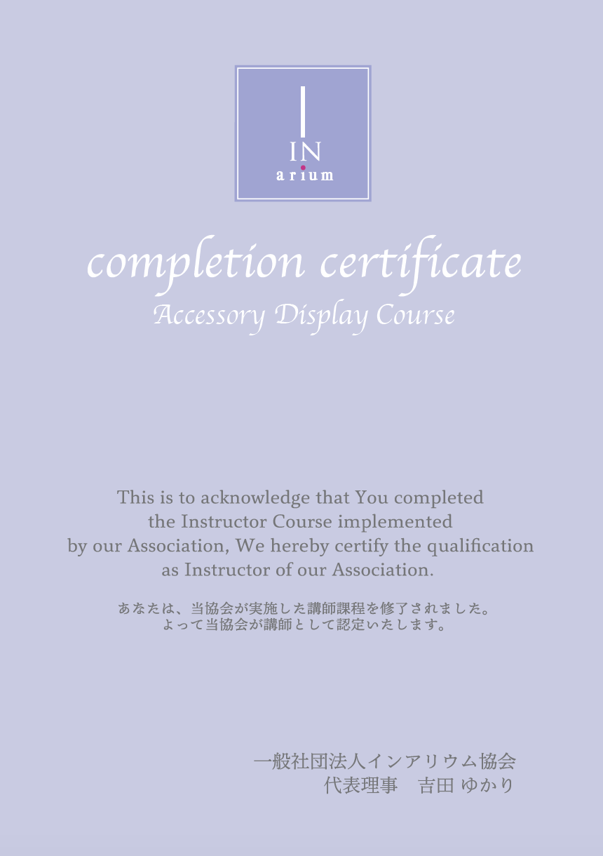 ・アクセサリーディスプレイコース認定レッスンは受講後会員になることができる一般社団法人インアリウム協会が定めるディプロマコースになります。